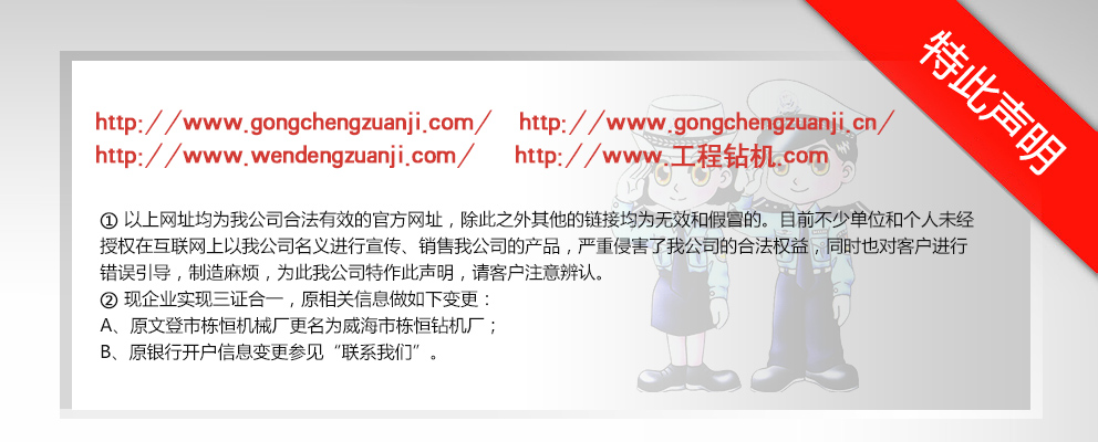 威海市棟恒鉆機(jī)廠隸屬于文登市工程鉆機(jī)廠,主要生產(chǎn)、銷售工程鉆機(jī)。它坐落于文登市西鋪頭工業(yè)園,這里科技發(fā)達(dá),交通便利,制造業(yè)集中。 自1982年建廠以來(lái),經(jīng)過多年的優(yōu)化改革和沉淀積累,擁有精密、大型加工設(shè)備近百臺(tái)的生產(chǎn)企業(yè)之一?,F(xiàn)在研制成功的GJ-400、GJ-250S、GJ-250A、GJ-240S、GJ-240A、GJ-180S、GJ-180A型等鉆機(jī)。在其它產(chǎn)品上,企業(yè)建立了長(zhǎng)期、中期、短期的發(fā)展規(guī)劃,一系列的高性能產(chǎn)品正在不斷推出中,企業(yè)應(yīng)市場(chǎng)需求對(duì)系列產(chǎn)品進(jìn)行了優(yōu)化組合,開發(fā)了與之對(duì)應(yīng)配套的三腿、四腿單天車輪、雙天車輪鉆塔;泥漿泵—BW-160Q、BW- 200Q型球形閥泥漿泵大大提高了泵的使用性能和機(jī)械效率